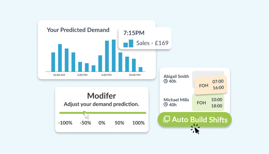 Lascia che AI e dati guidino i turni. Con Workforce.com, i ricavi e i dati dei turni delle settimane precedenti vengono usati per prevedere con precisione la domanda e costruire i turni migliori. Così programmi automaticamente le persone giuste al momento giusto.