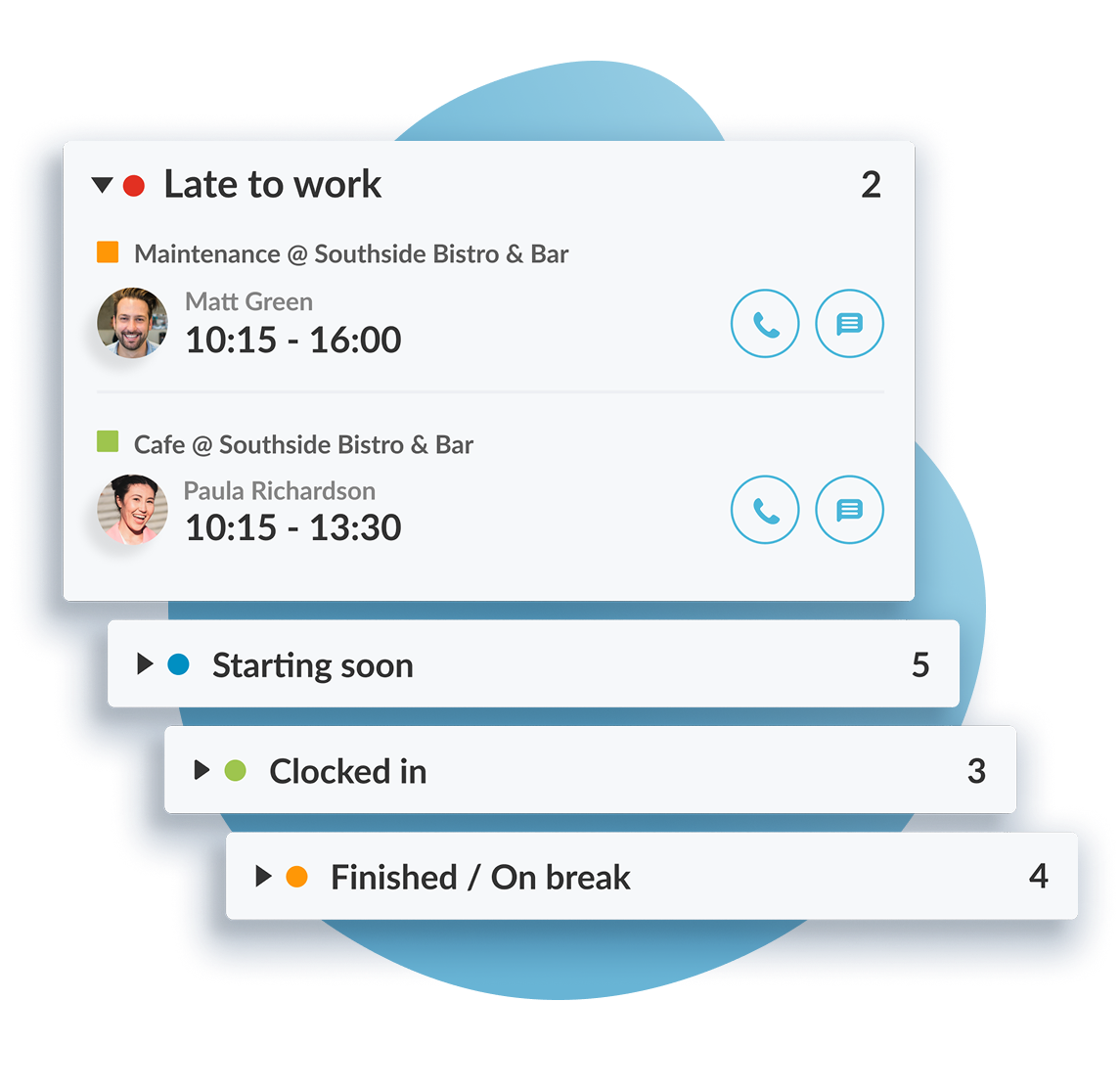 See who’s coming in for the day, what time they’re scheduled to start, and which location they’re at. Keep an eye on multiple teams & venues right from your phone.